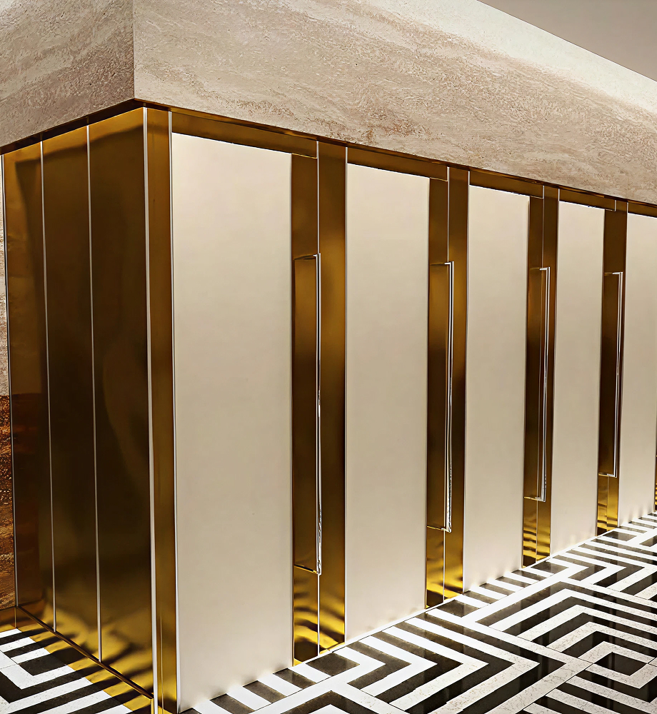 Фудкорт «Депо трёх вокзалов»Двери скрытого монтажа в санузлы со вставками из нержавеющей стали и напылением нитрид титана под золото. Стеновые панели из нержавеющей стали закреплены в одной плоскости с дверными полотнами. Срок реализации — 2 месяца |