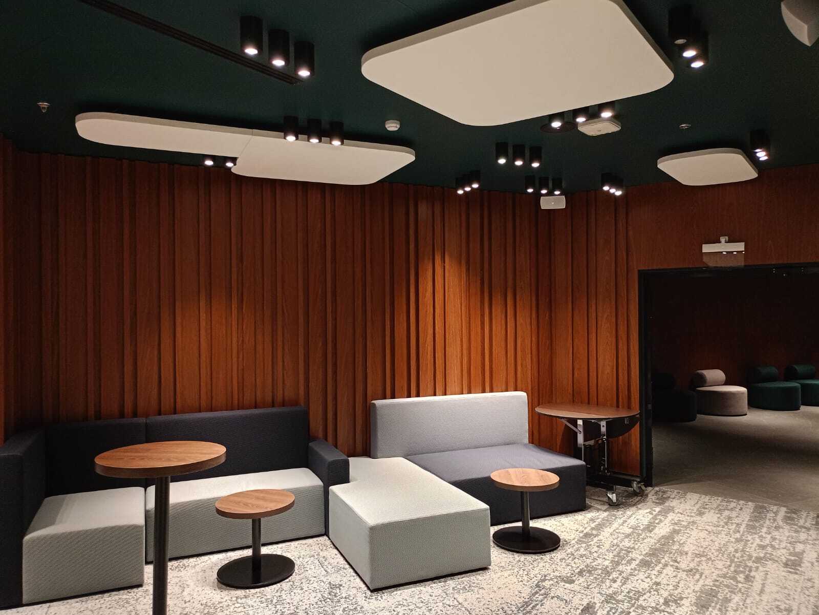 Гостиница «Казань»Рельефные стеновые панели из шпона американского ореха придают пространству элегантность и статусность. Панели в переговорной и кинозале гармонично сочетаются с деревянными столешницами и ступенями, контрастируя с изумрудными стенами. Срок реализации — 2 месяца |