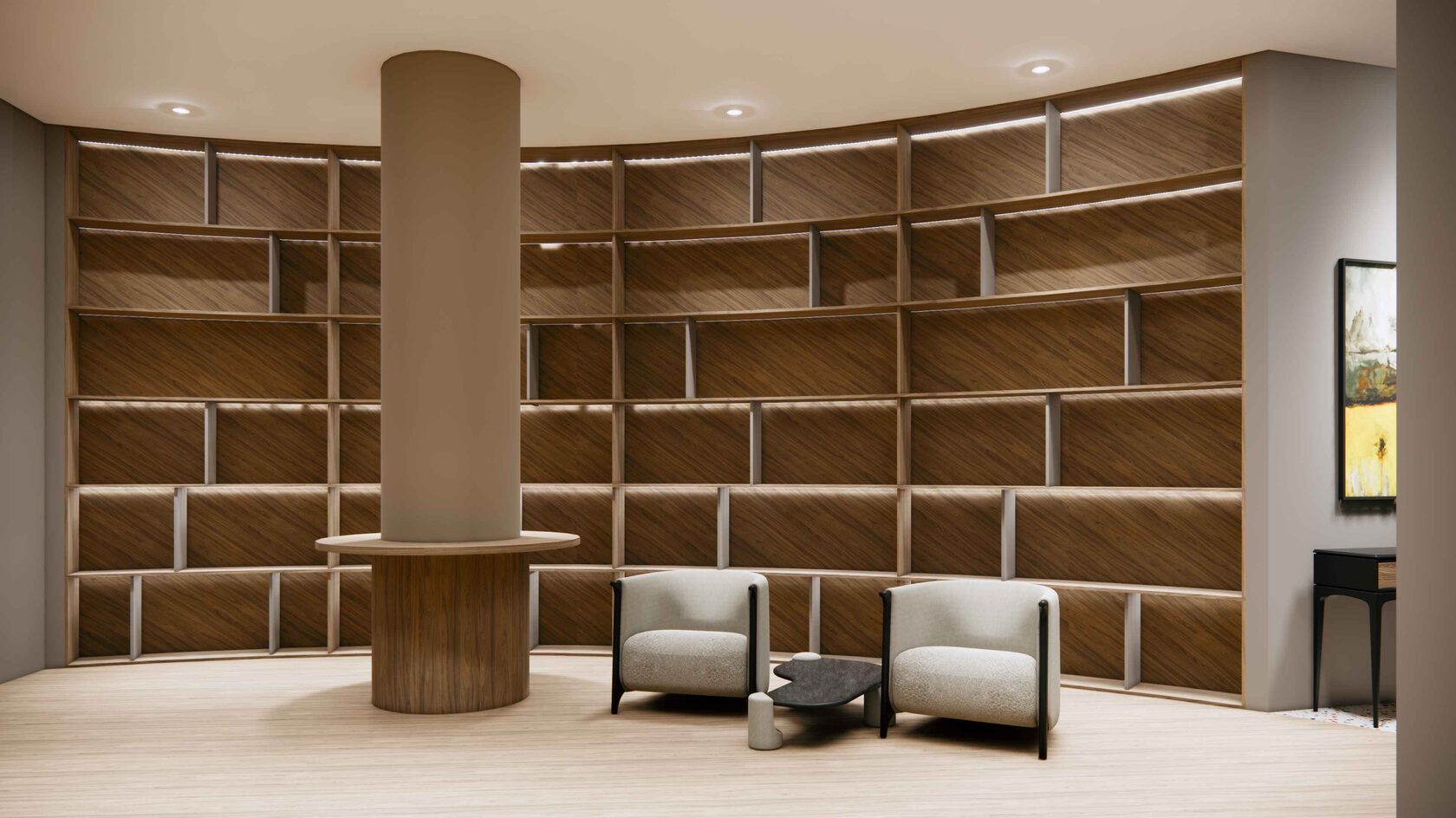 Скрытые дверные полотна словно растворяются в панелях из натурального шпона — теплых, живых, с тонким рисунком древесной текстуры. Пространство дополняет высокий радиусный шкаф и обрамление колонн.