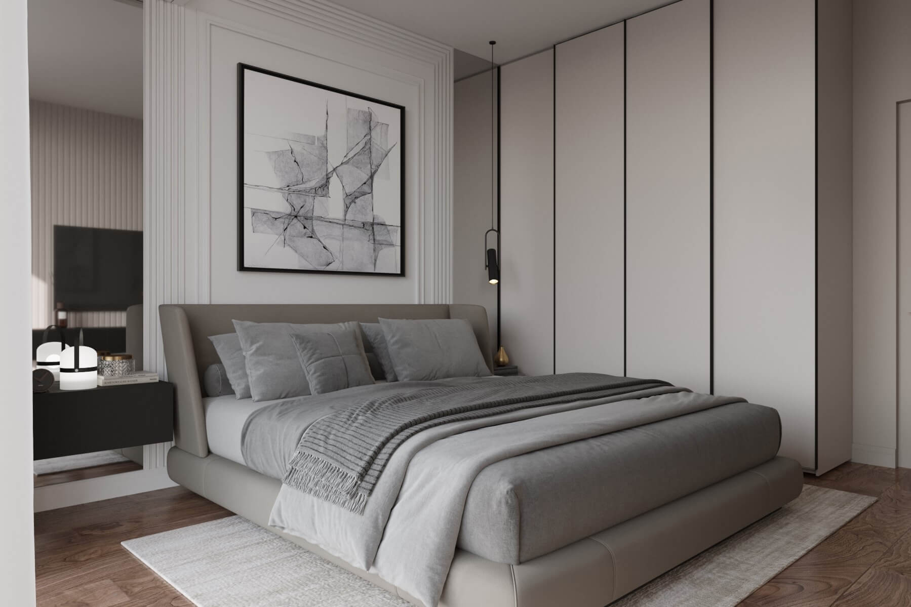 Квартира на КутузовскомШкафы выполнены под заказ и интегрированы в интерьер четырёх помещений: гостиной, холла, мастер-спальни и детской. Скрытые двери сливаются с обшивкой стен. Рейки над кроватью в спальне выполнены из дерева и добавляют визуальный акцент, а также зонируют комнату. Срок реализации — 2 месяца |